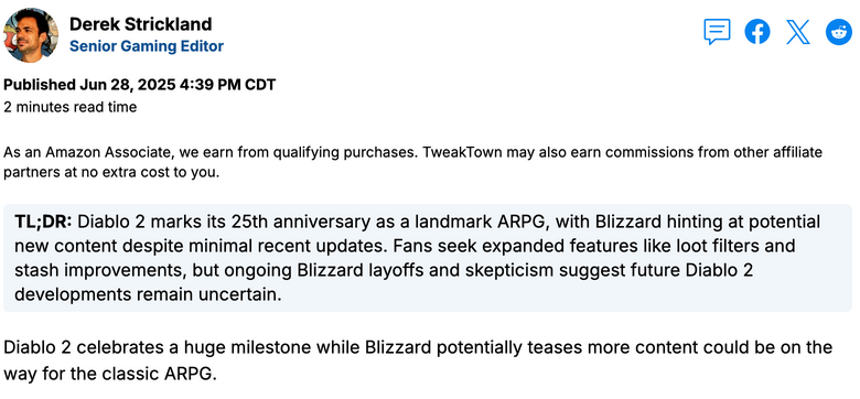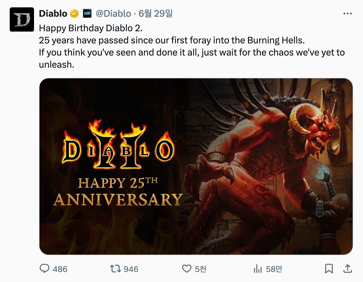 디아블로2가 어느덧 25주년을 맞이했습니다. 2000년에 처음 출시된 이후 전 세계 게임 팬들에게 사랑받아온 게임인데요. 이번 25주년을 기념해 게임 제작사인 블리자드가 공식적으로 의미심장한 글을 남겼습니다.